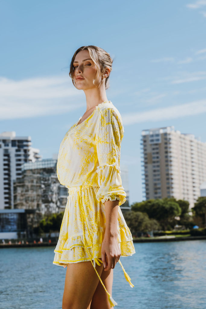 A short dress with a dropped, elasticized waist. It depicts the Minerva White print with subtle details like trims on the hemline and two tassels hanging from the sides. The long sleeves have elasticized cuffs. The round neckline is also elasticized. It’s ideal for casual daytime looks.