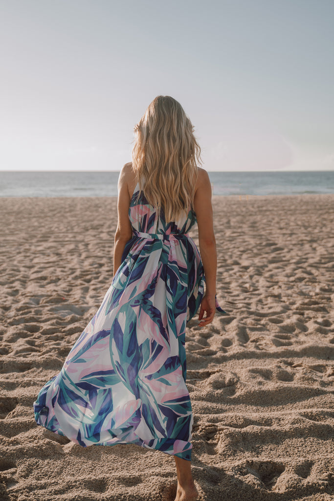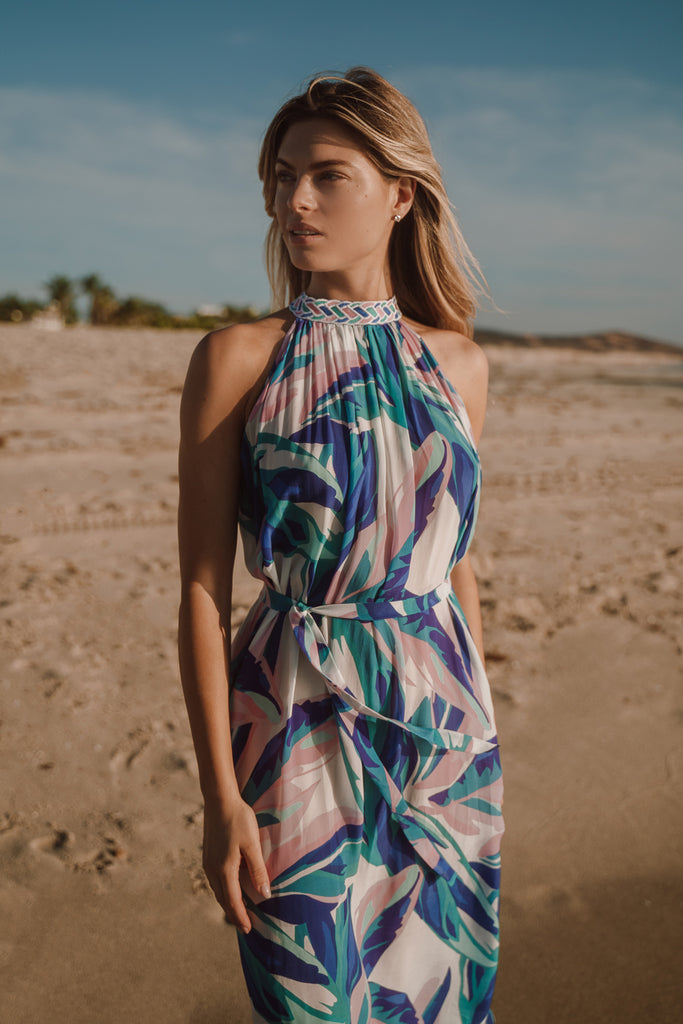 The Fane Maxi Dress in Genus Musa Blue is a sophisticated and flowy piece designed to make a statement. This halter-style maxi dress features a vibrant, tropical-inspired blue pattern that captures attention. Made from soft and lightweight viscose fabric, it drapes beautifully, making it perfect for warm weather. The high neckline and flowing silhouette provide a flattering fit, while the self-tie at the neck adds a touch of elegance and versatility. Ideal for summer getaways or special occasions, the Fane Maxi Dress exudes effortless style.