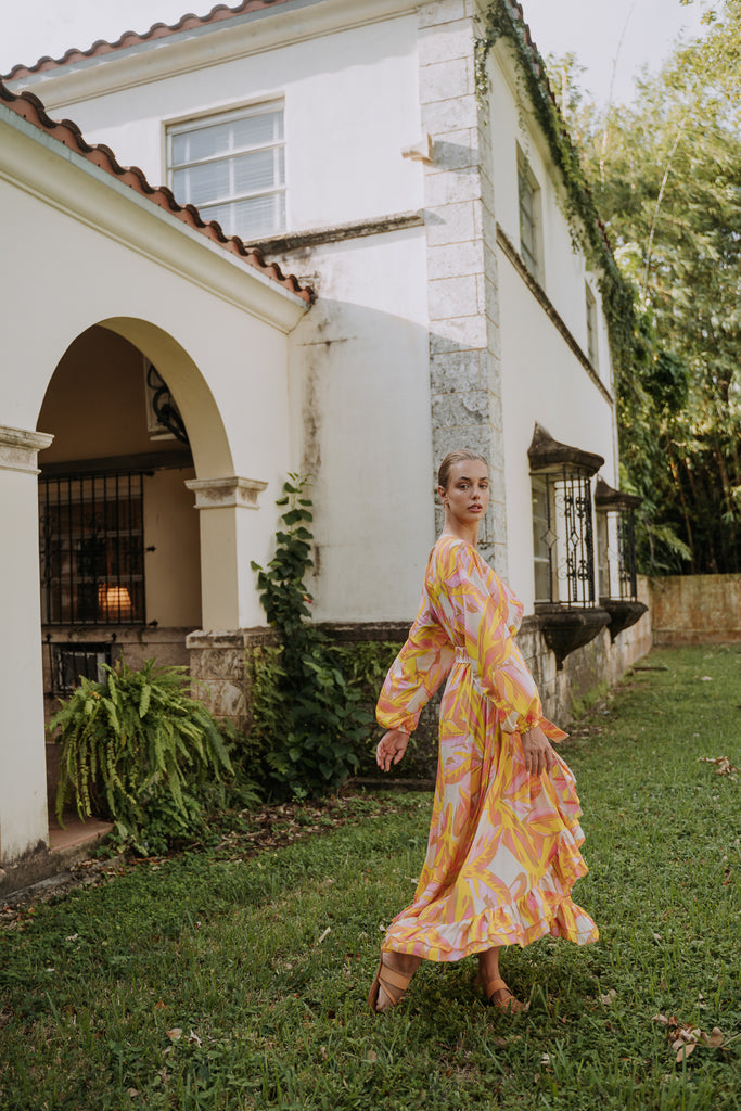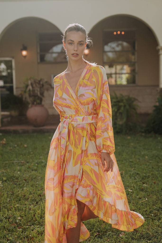 The Farajil wrap dress in Genus Musa Orange print is a striking blend of elegance and comfort. Crafted from a luxurious cotton and silk blend, this dress provides both softness and a subtle sheen. The wrap design accentuates the waist, creating a flattering, feminine silhouette, while the long sleeves add a touch of sophistication. The bold Genus Musa Orange print features vibrant, tropical-inspired patterns, making this dress perfect for warm-weather events or vacations. The asymmetrical hemline adds movement and flow, making it a show-stopping piece for any occasion.