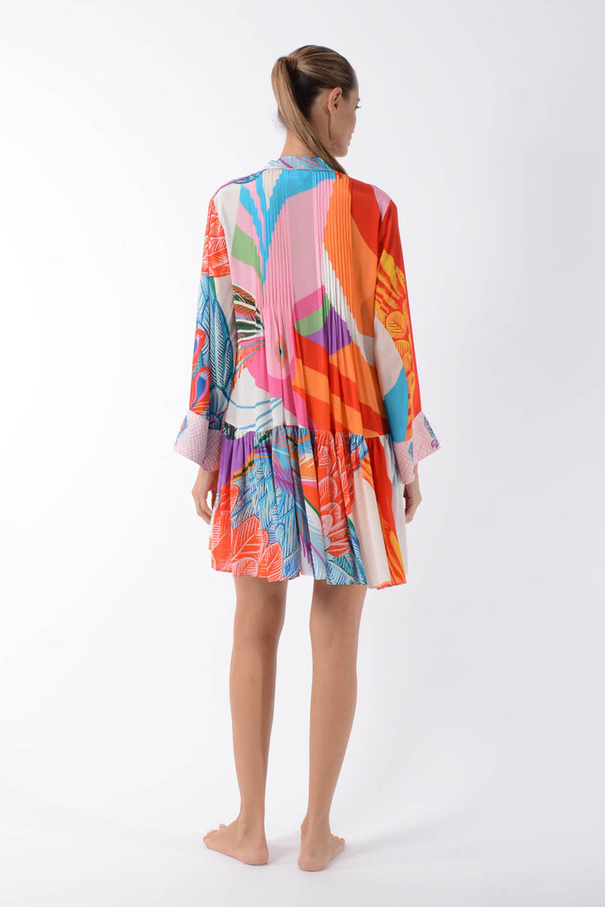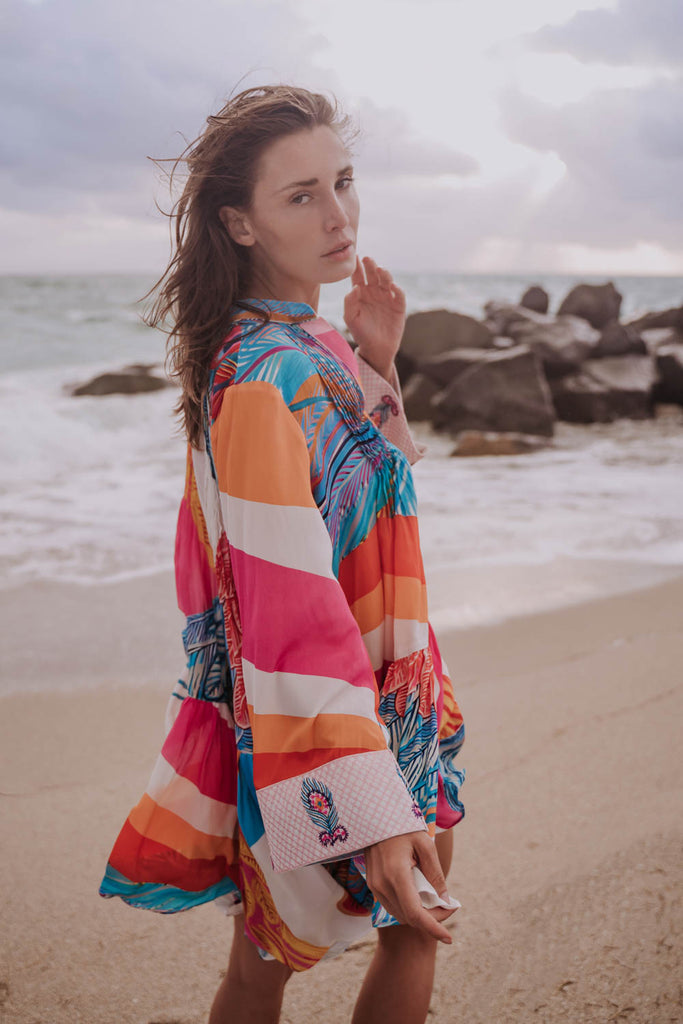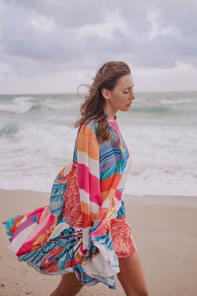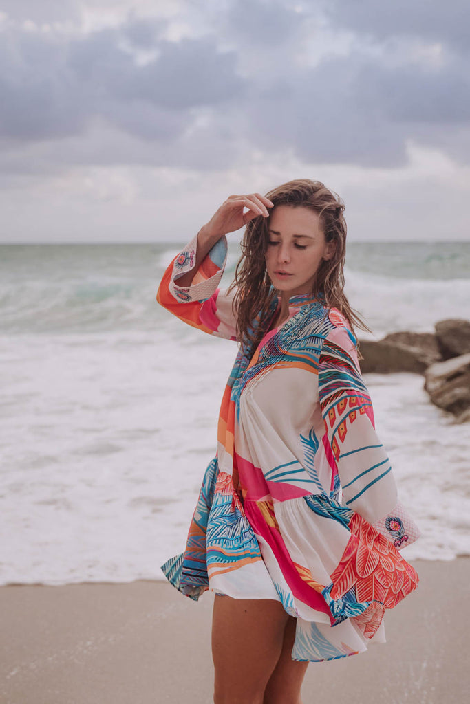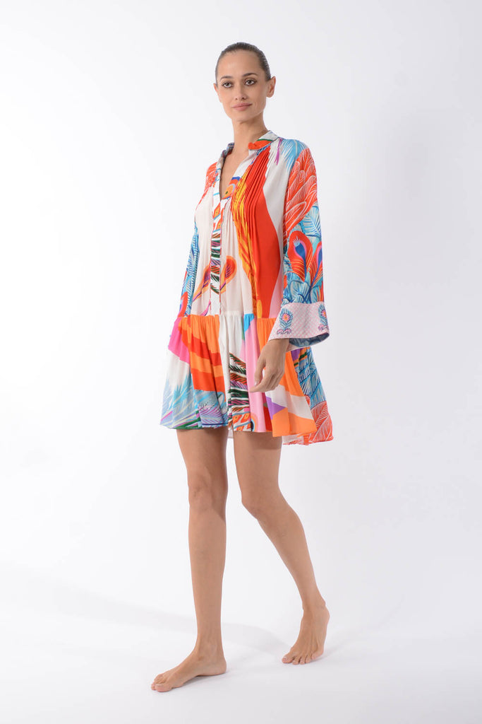 Bring bold artistry to your style with the Fiore midi dress in the striking Mealy Bird Maxi print. Crafted from viscose , this dress features a relaxed silhouette with a button-down front and a classic collared neckline for an effortlessly chic vibe. The long sleeves with playful bell cuffs add a touch of flair, while the vibrant abstract design ensures you’ll stand out in any crowd. Style it with flats for a casual day look or pair it with heels for an eye-catching evening ensemble.