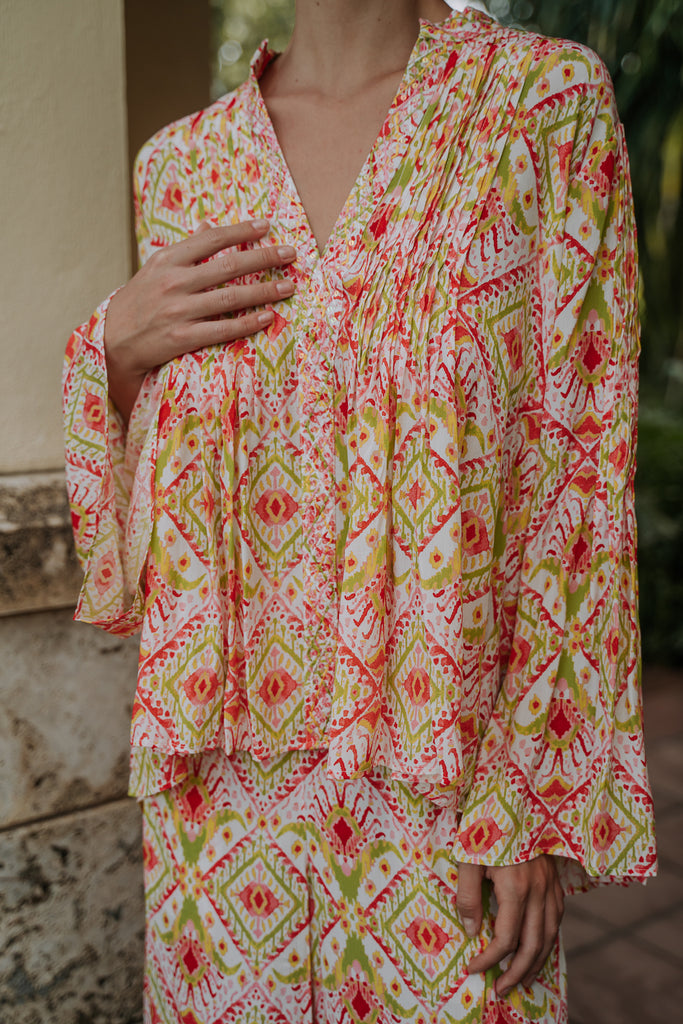 The Francy Flare Top in Talvera is a vibrant and playful piece that combines comfort with chic design. Crafted from soft and lightweight viscose, this top features a flared silhouette that adds a touch of elegance to any outfit. The colorful Talvera print showcases intricate patterns, making it a standout option for both casual and dressy occasions. The relaxed fit ensures breathability, while the long sleeves and flowy hemline make it perfect for a variety of seasons. Pair it with matching pants or your favorite jeans for an effortlessly stylish look.