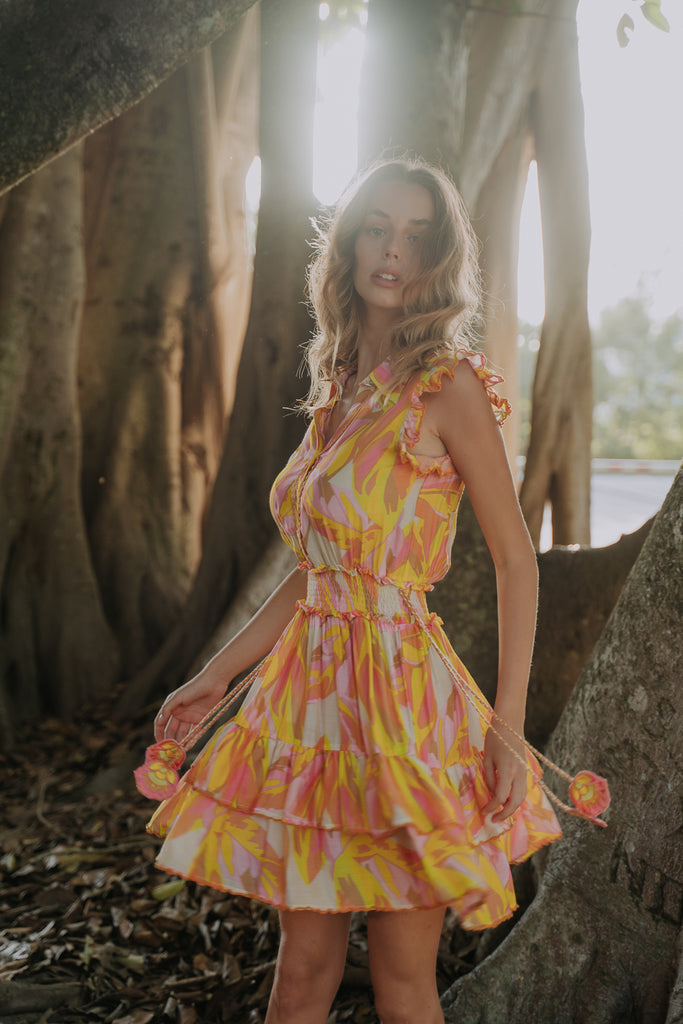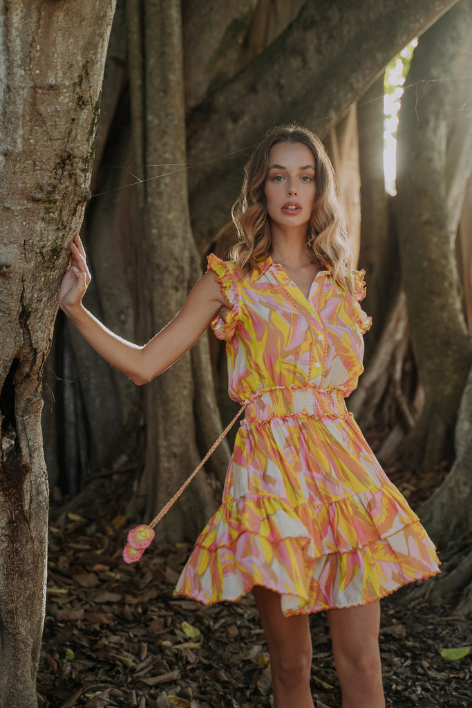 The Gia mini dress in Genus Musa Orange print is a stunning combination of bold patterns and feminine charm. Made from a luxurious blend of cotton and silk , this dress offers both softness and a lightweight feel, perfect for warmer weather. The dress features a flattering fitted bodice with cap sleeves and a cinched waist, flowing into a playful A-line skirt. The vibrant Genus Musa Orange print, inspired by tropical motifs, brings a lively energy to the design. The Gia mini dress is a perfect choice for those looking to make a stylish statement, whether for a casual day out or a special occasion.
