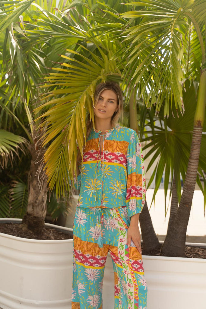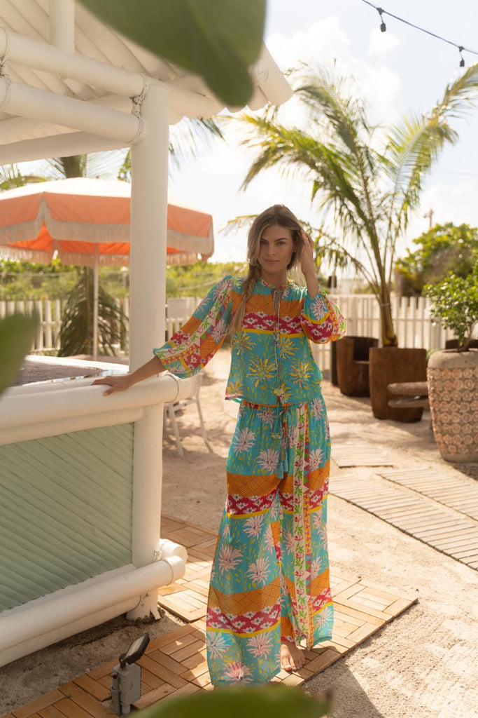 The Helene pants in our Capri Flowers in Spring print are a statement in effortless elegance. The breezy wide-leg silhouette and soft fabric move with you, while the adjustable drawstring waist with delicate ruching and handmade tassels add an artisanal finishing touch. Whether paired with the matching top or styled on their own, these pants deliver laid-back luxury with a playful twist.