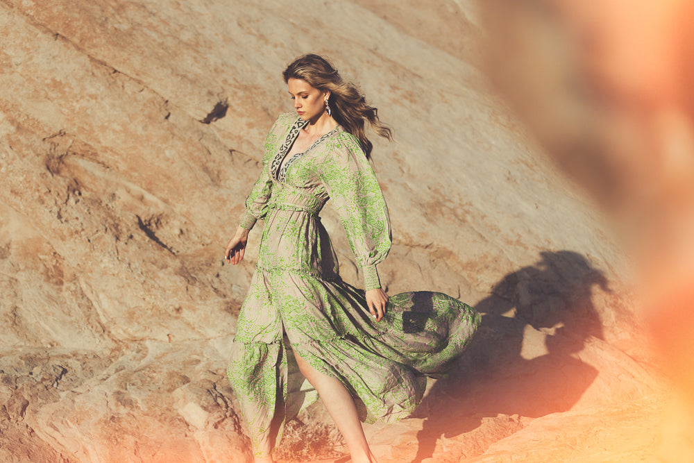 The Lulu Maxi Dress with Slit in Animal Green is a captivating blend of comfort and style. Made from a luxurious cotton and silk fabric, this maxi dress is adorned with a lively animal print in a striking green hue. Its floor-length silhouette is elegantly broken up by a side slit, adding a touch of allure while enhancing ease of movement. The V-neckline and flowing fit make it both flattering and breathable, perfect for both casual summer days and more formal occasions.