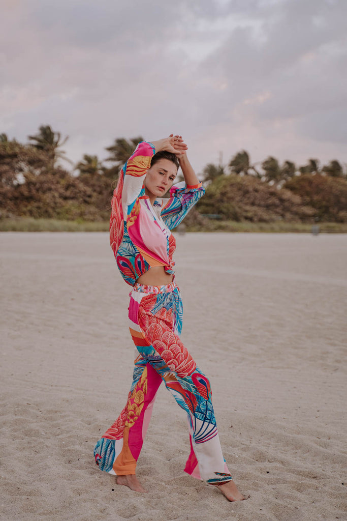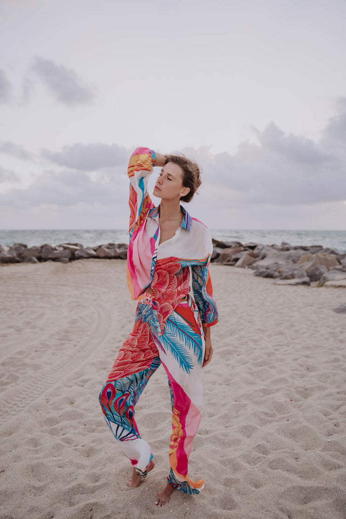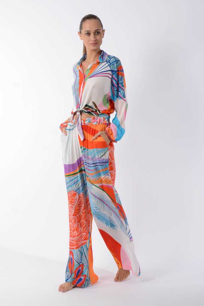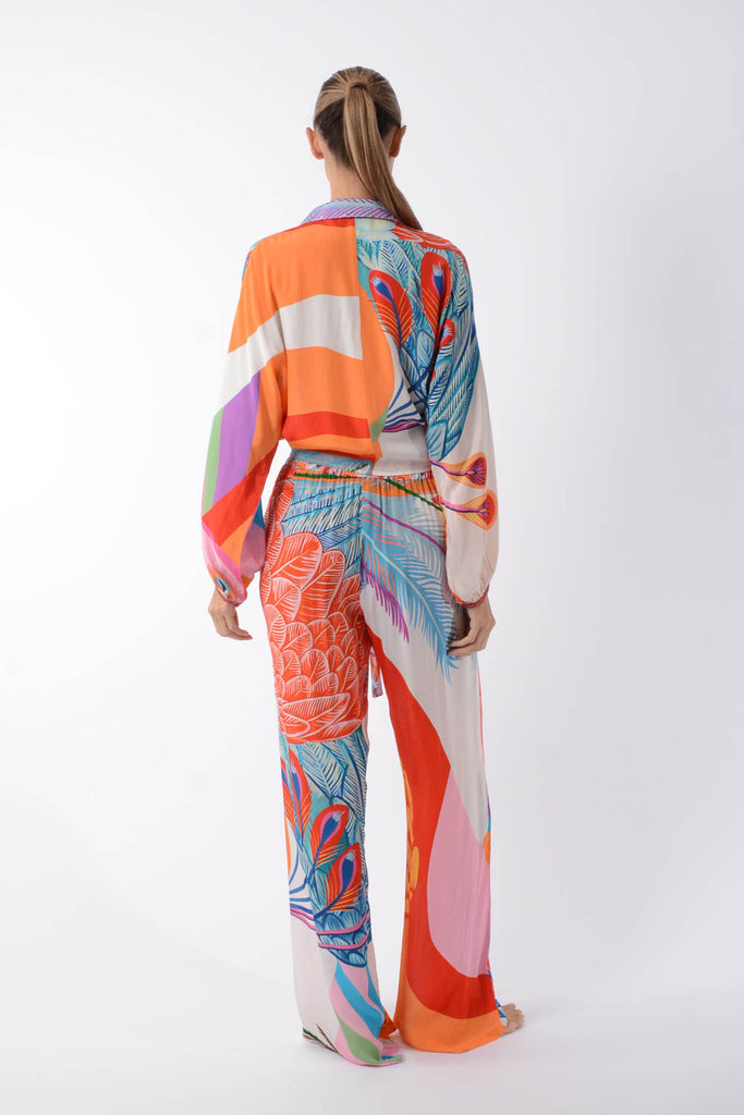 Add a pop of color and versatility to your clothing with the Mia tie top, showcasing this Mealy Bird Maxi print. Made from viscose this top features a relaxed fit and a tie-front design for a customizable and playful look. The collared neckline and long sleeves lend a touch of sophistication, while the bold abstract print ensures you stand out in any setting. Style it with the matching Dominique pants for a coordinated outfit or pair it with solid bottoms to let the print shine.