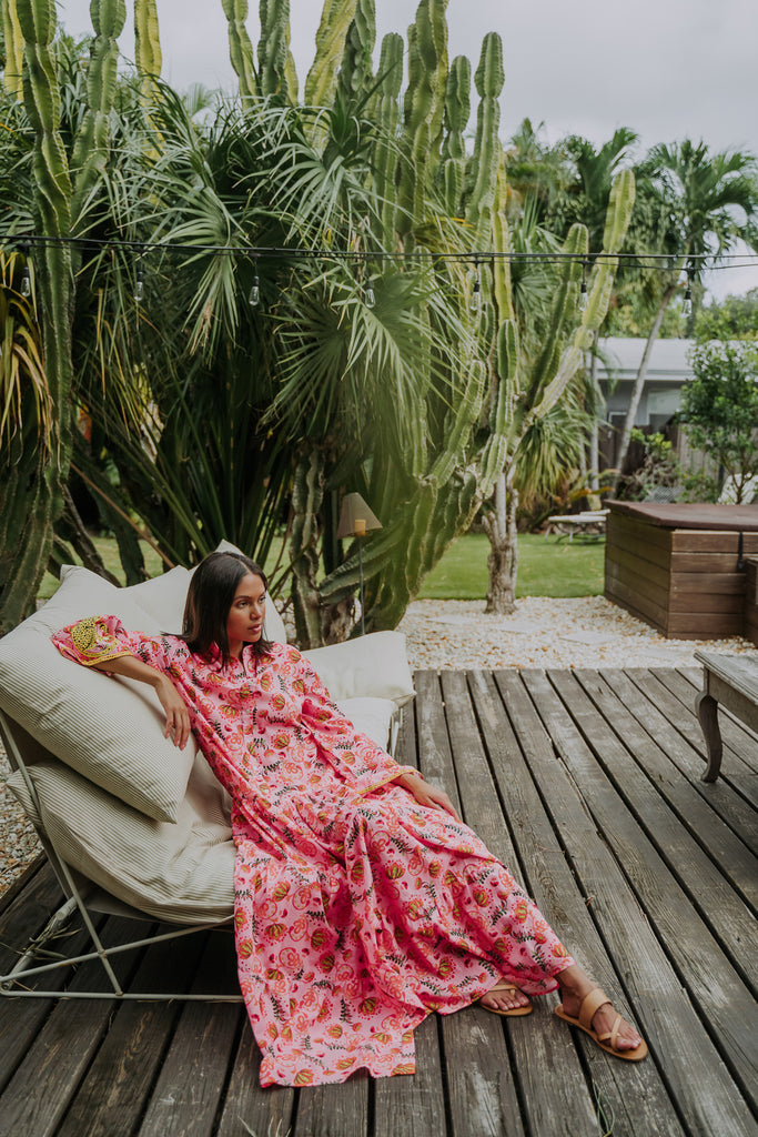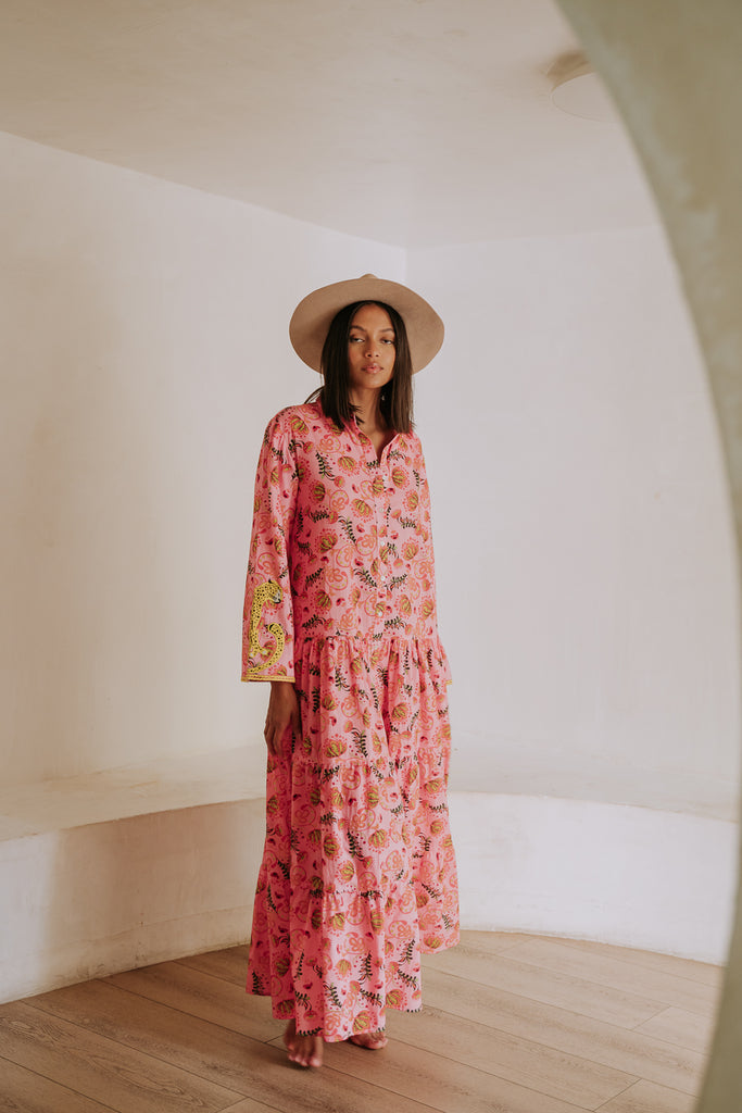 This Yucatan Flowers maxi dress is a beautiful combination of elegance and bold design. Made from breathable cotton , the dress provides comfort and style, making it ideal for day-to-night wear. The vibrant Yucatan Flowers print, featuring bold floral patterns, adds an eye-catching appeal. Designed with long sleeves and a subtle button-down front, the dress exudes a sophisticated charm. The flowy skirt and gathered waistline create a flattering silhouette that moves gracefully.