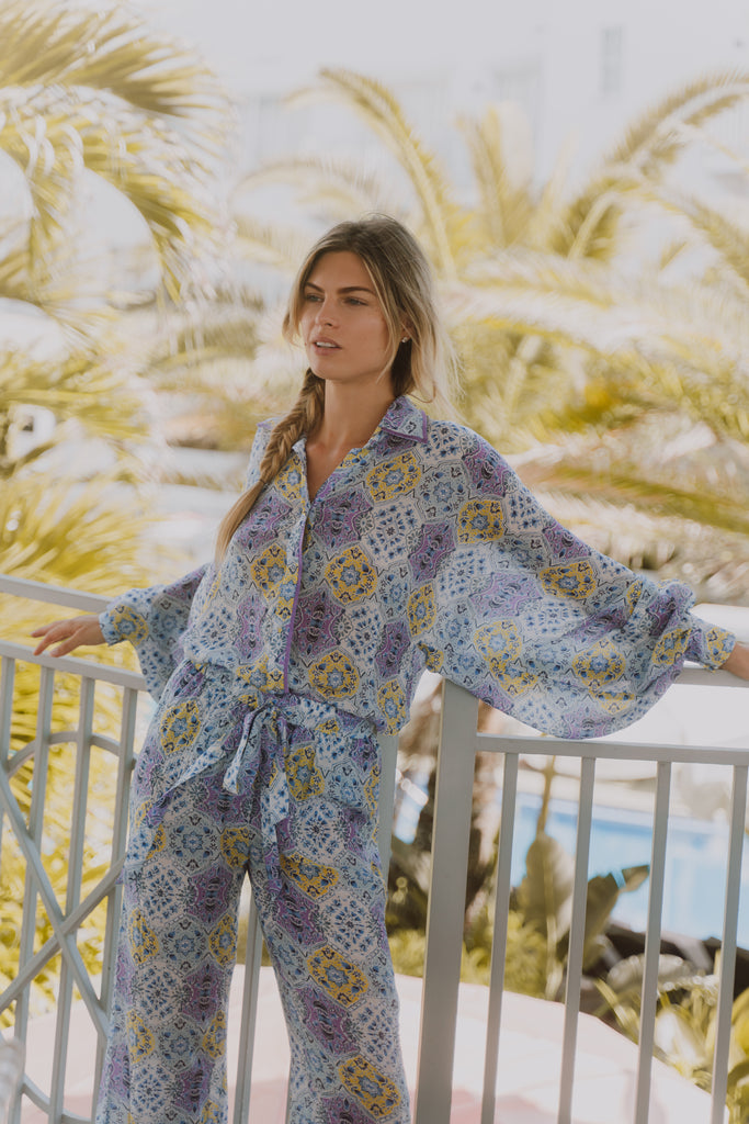 A shirt-style top in our Zellige Tile print fabric. It boasts a relaxed silhouette with a shirt collar and long sleeves, the design is perfect for both day and evening occasions.
