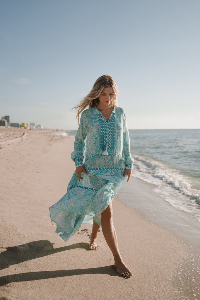The Tucci Maxi Dress in Animal Blue is an effortlessly elegant piece made from a blend of cotton and silk, combining breathability with a touch of luxury. This floor-length dress features a soft, flowing silhouette with long sleeves and intricate detailing across the bodice. The striking blue animal print adds a bold, fashion-forward flair, making it perfect for any occasion, from a casual day out to an evening event. Its lightweight material ensures comfort while maintaining a sophisticated look.