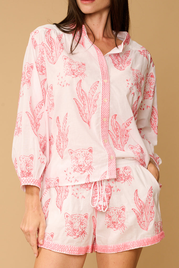 The Tulum Top in Solid Color Pink is a vibrant and stylish addition to any wardrobe. This top features a relaxed fit with a button-down front, making it perfect for layering or wearing on its own. The lightweight cotton fabric ensures comfort in warm weather, while the playful pink hue adds a touch of fun to any outfit. With its versatile design, the Tulum Top can be paired with shorts, skirts, or pants for a chic and effortless look, making it a great choice for casual outings or beach days.