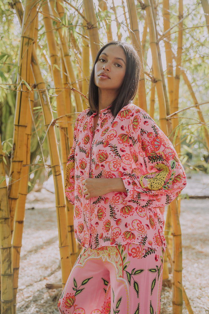 The Tulum top in Yucatan Flowers print is a perfect mix of bold style and bohemian elegance. Made from soft viscose , this top is lightweight and breathable, making it ideal for any season. The long, billowing sleeves with fitted cuffs add an air of sophistication, while the relaxed fit ensures comfort. The vibrant Yucatan Flowers print features intricate floral designs in lively colors, making this top a statement piece.
