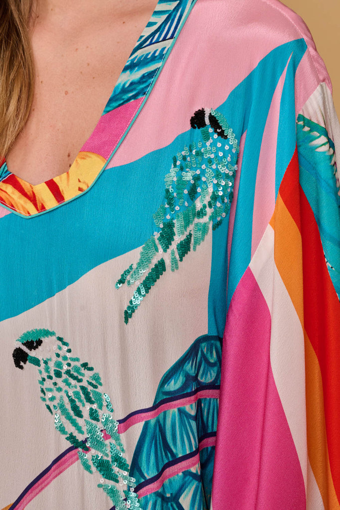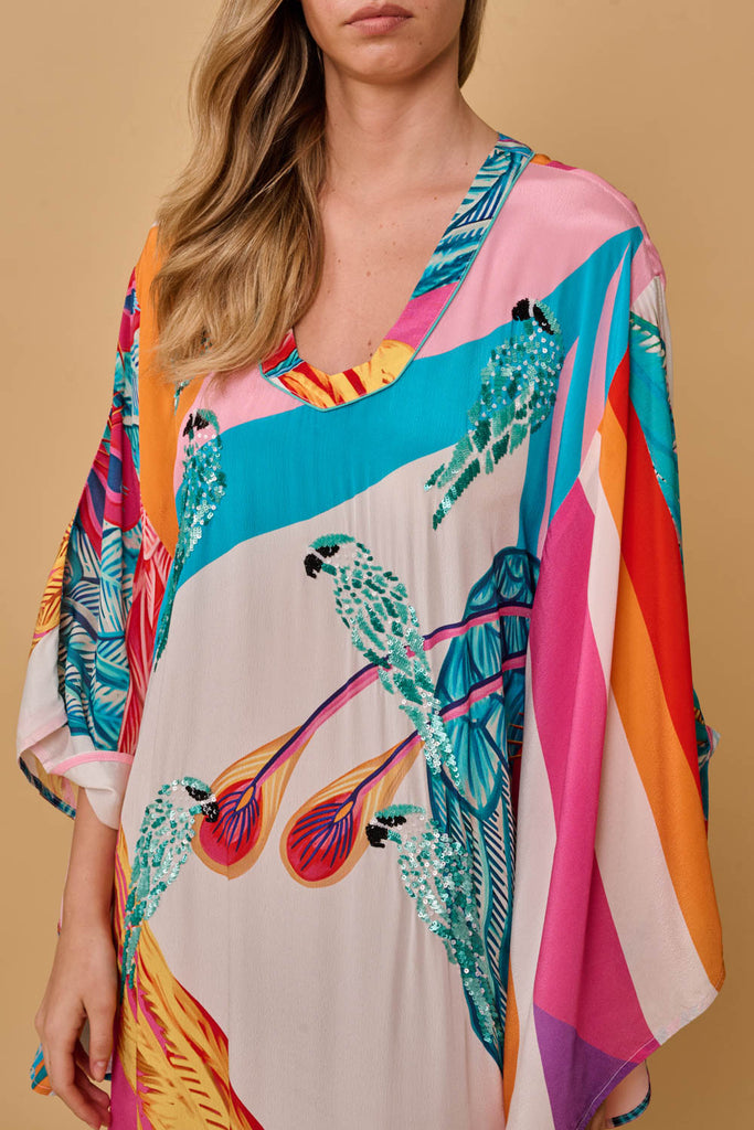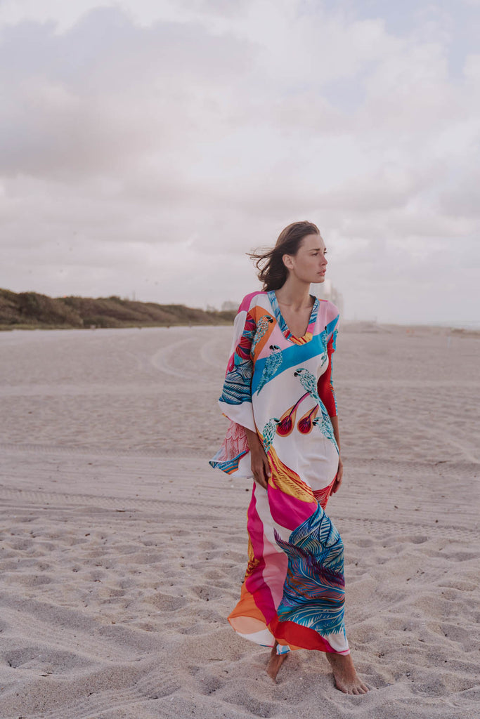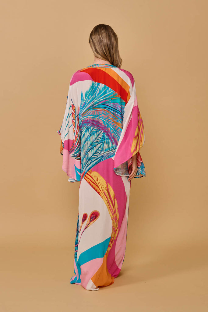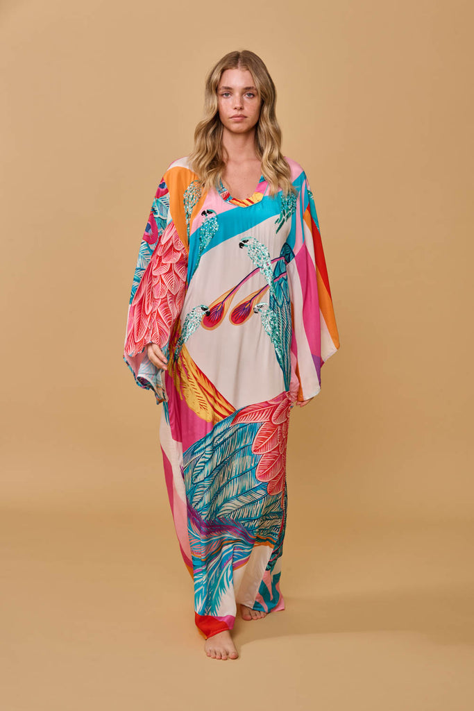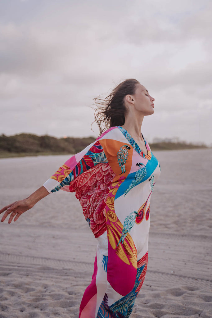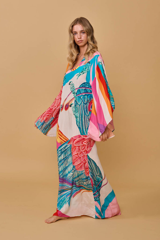Step out in style with the Delfina maxi dress, featuring the bold and vibrant Mealy Bird Maxi print. Made from viscose, this dress offers a relaxed fit and an elegant drape that enhances its effortlessly chic silhouette. The V-neckline and wide kimono-style sleeves add a touch of sophistication, while the vibrant abstract design ensures you make a statement. Perfect for both daytime gatherings and evening occasions, pair this dress with simple accessories to let the print take center stage.
