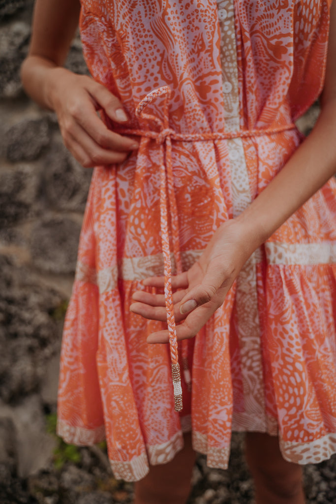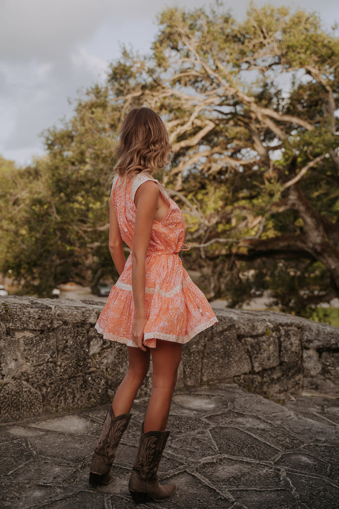 The Mirage mini dress in Animal Orange print is a playful yet sophisticated piece that adds a bold touch to any wardrobe. Made from cotton, this dress ensures both comfort and style. It features a sleeveless design with a flattering V-neckline and a cinched waist, creating a defined, feminine silhouette. The tiered skirt adds volume and movement, while the vibrant Animal Orange print makes this dress stand out. .