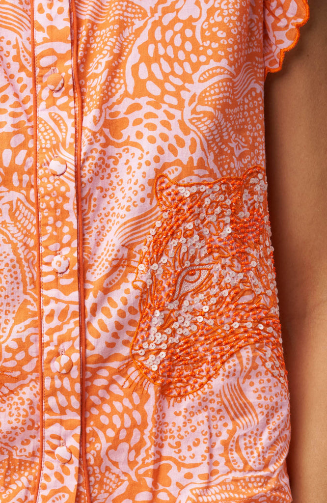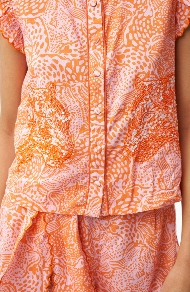 Add a bold yet feminine flair to your wardrobe with the Valeria Top in the striking Animal Orange print. Crafted from soft, breathable viscose, this sleeveless top is designed to elevate your everyday look. The delicate ruffle-edged sleeves and structured collar give it a playful sophistication, while the sequin-embellished animal motifs add a touch of fierce glam.