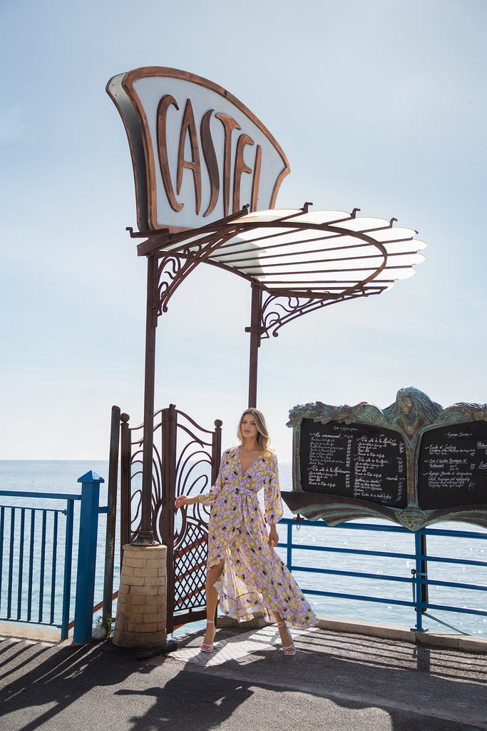 A gorgeous, breezy wrap dress in Limoncello print. Its long bishop sleeves are embellished to add that wow factor. The silhouette is relaxed and comfy, with a bias-cut strap wrapped around the waist. The hemline is high in the front and low in the back, creating asymmetric flare. It can easily transition from a day look to a party outfit.