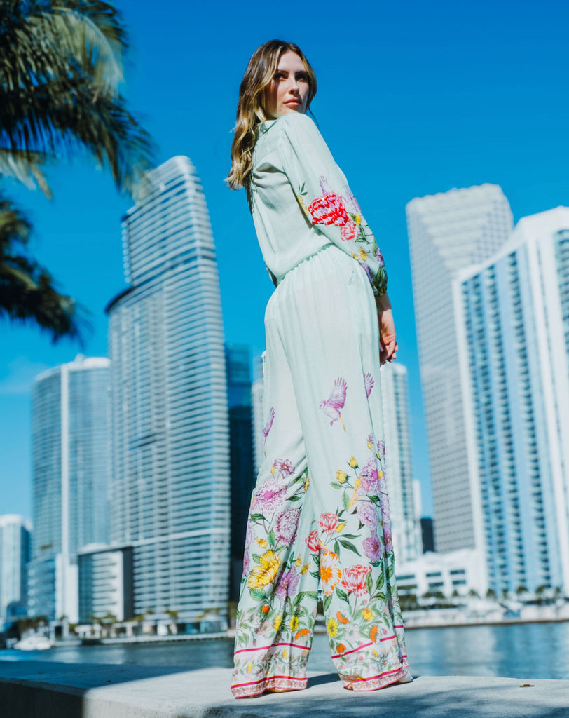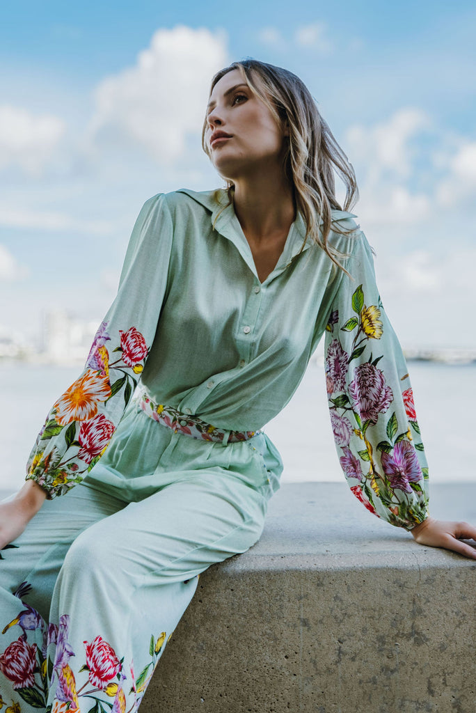 A tailored shirt-style top with loose long sleeves boasting the Secret Garden Green print. The button placket is accented with subtle multicolor embroidery that complements the print’s colors. The fit is relaxed, combining comfort with a big doze of style. Pair with Secret Garden print pants in white for a cohesive outfit.